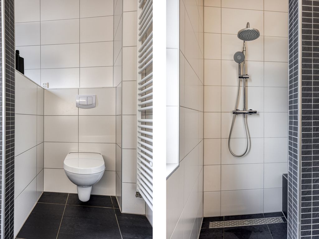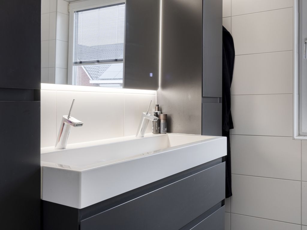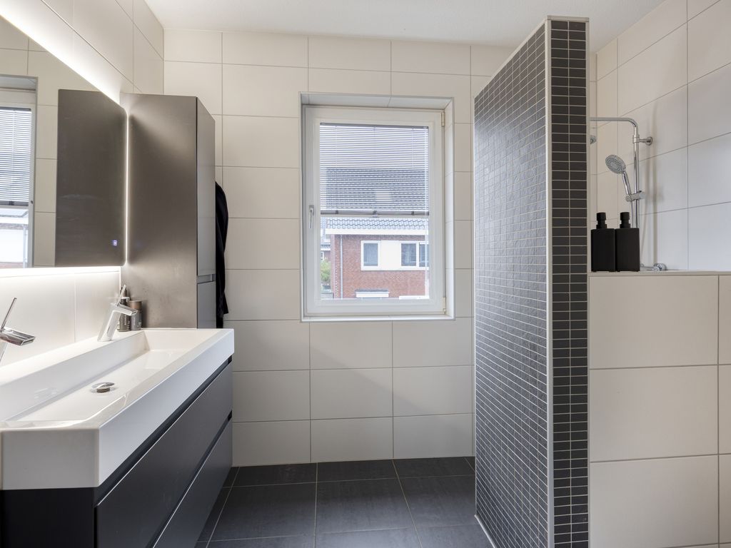 De modern betegelde badkamer is uitgevoerd met een inloopdouche, wastafelmeubel met dubbele wastafel en tweede toilet.