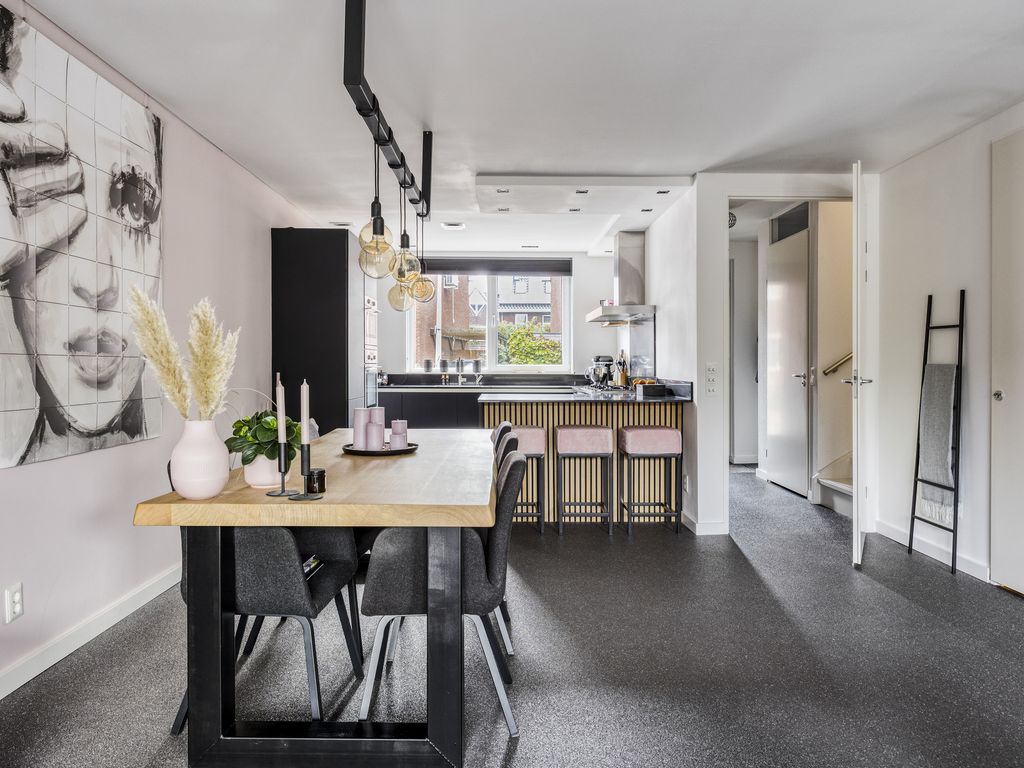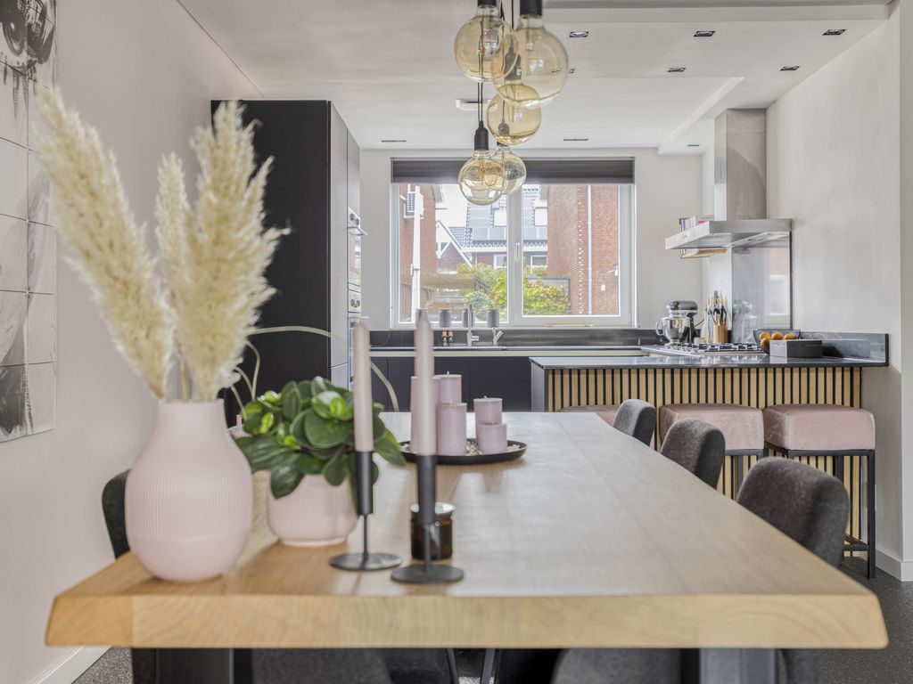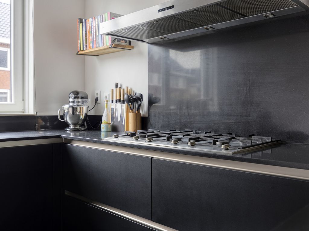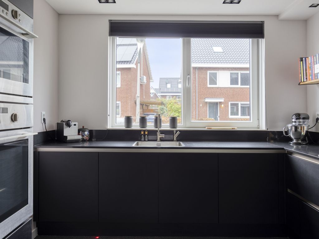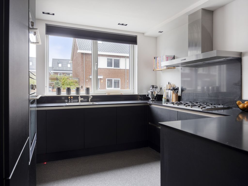 De open keuken bevindt zich aan de voorzijde van de woning en beschikt over een moderne zwarte U-hoekopstelling die is uitgevoerd met een hardstenen werkblad, spoelunit, Quooker, 6 pits gaskookplaat, afzuigkap, oven, combimagnetron, koelkast, vriezer, vaatwasmachine en ontbijtbar.