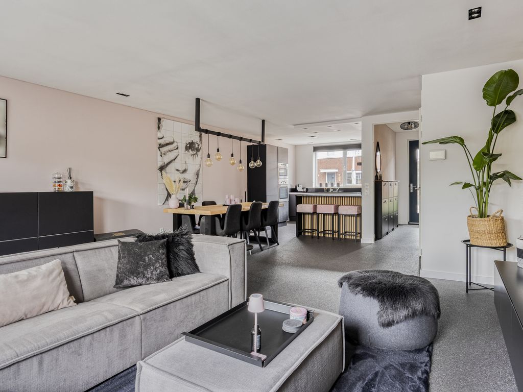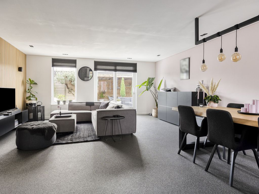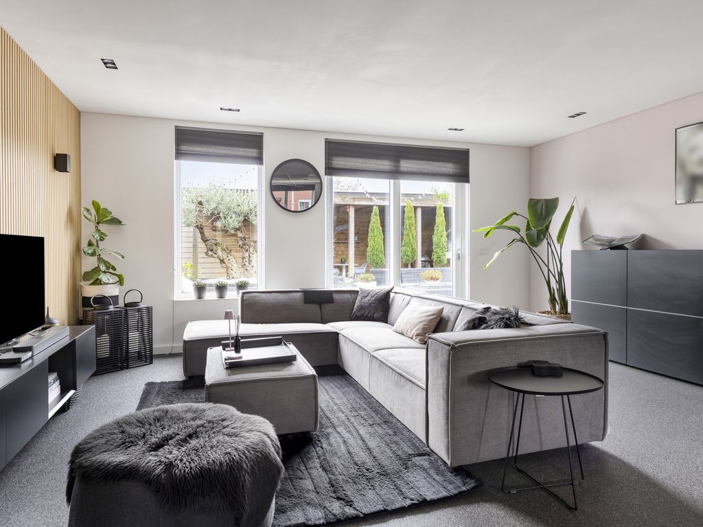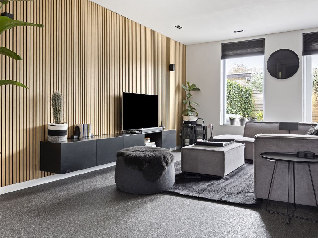 Uitgebouwde tuin gerichte woonkamer met trapkast, glad gestucte wanden en een wand met fraaie akoestische panelen. Het plafond is verlaagd en uitgevoerd met inbouwspots. Via de schuifpui is de achtertuin bereikbaar.