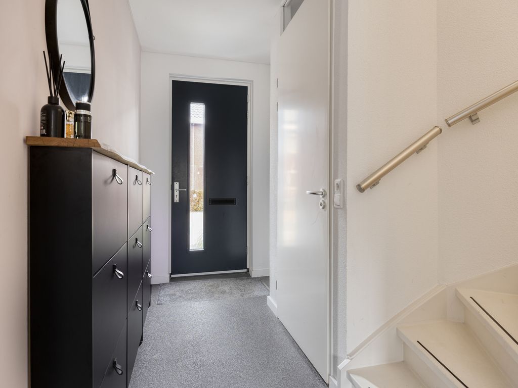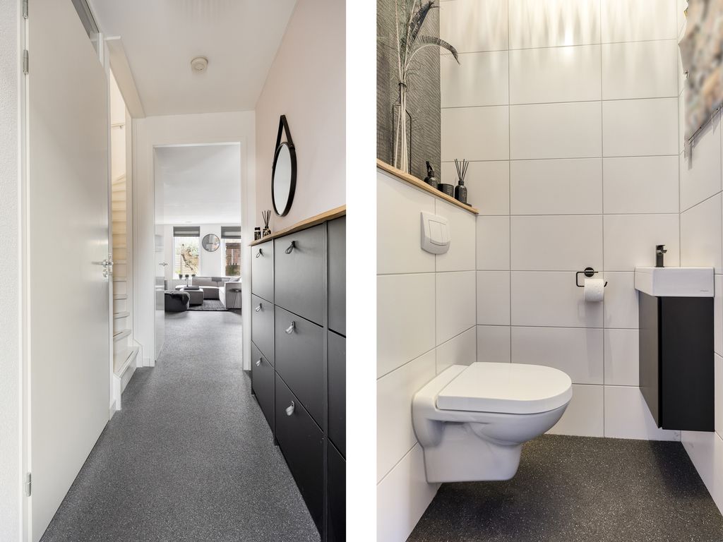 Entree/ hal met garderobe, meterkast met de unit van de waterontharder, trapopgang en betegeld toilet met fonteintje. De vloer is uitgevoerd met een prachtig siergrind met vloerverwarming.