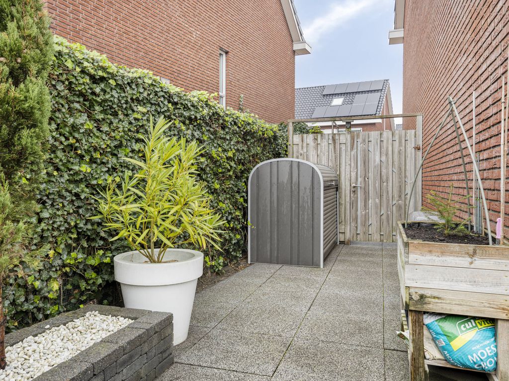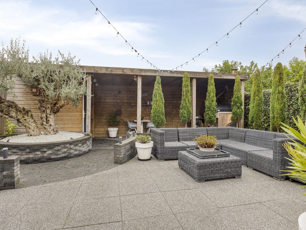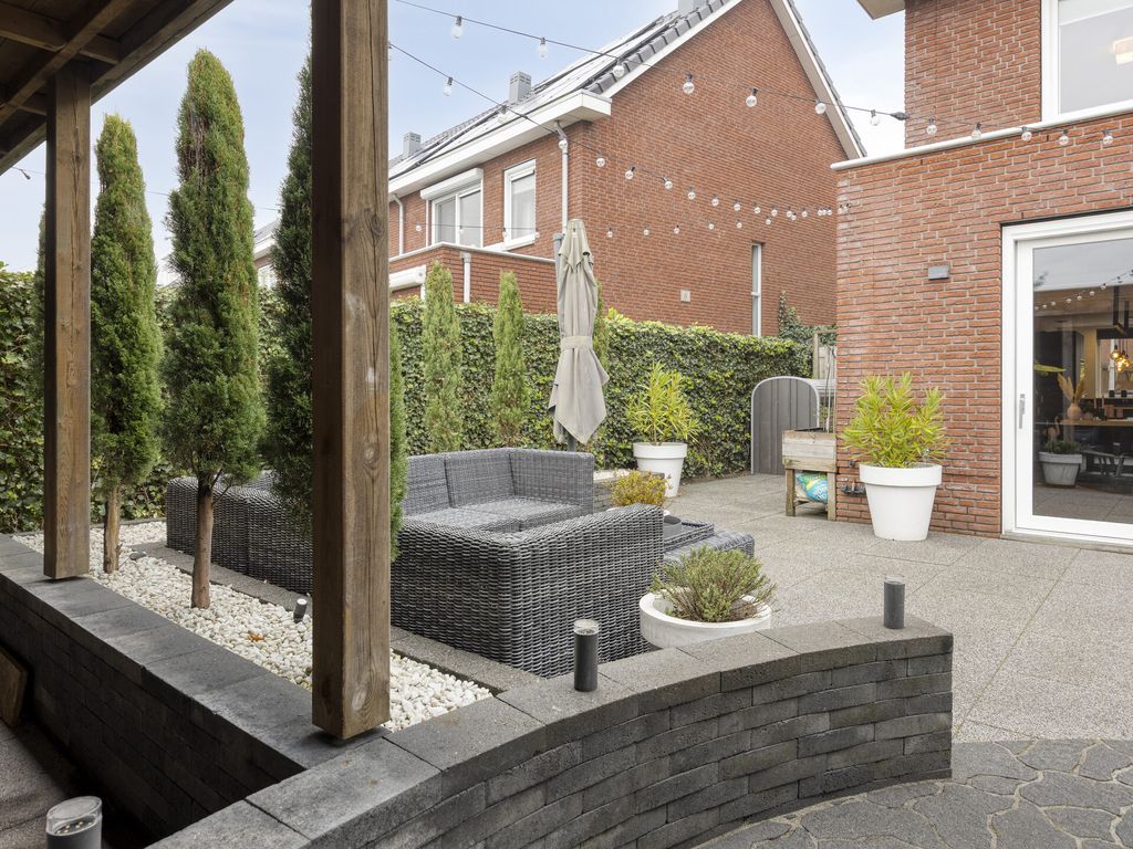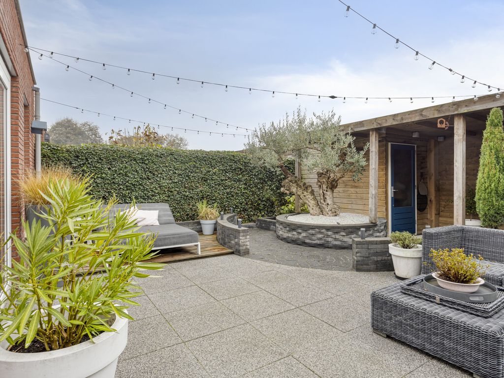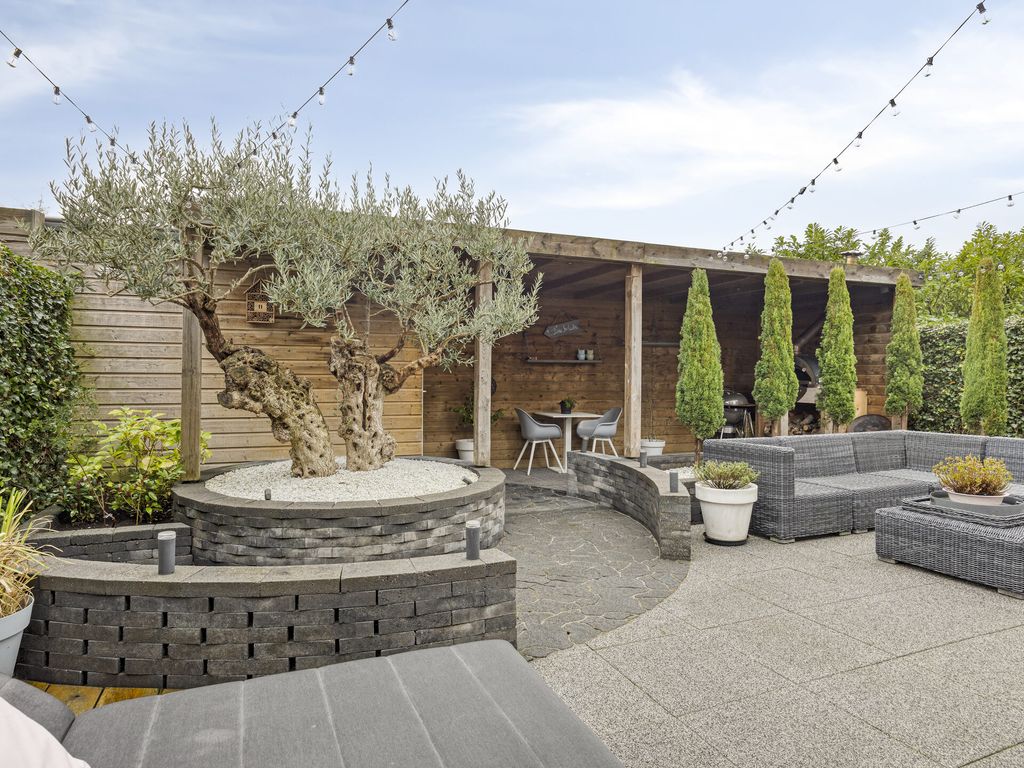 De sfeervolle achtertuin is gelegen op het zuiden en is fraai aangelegd met een terras, border met olijfboom en sfeervolle terrasoverkapping. Verder bevindt zich hier de fietsenberging. De tuin heeft een achterom via de zijtuin van de woning.