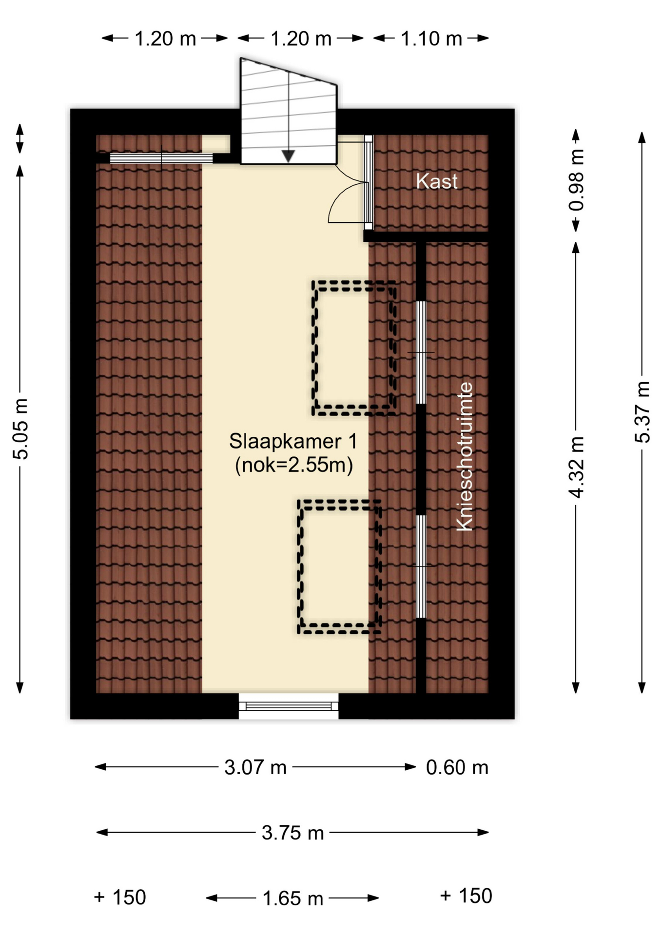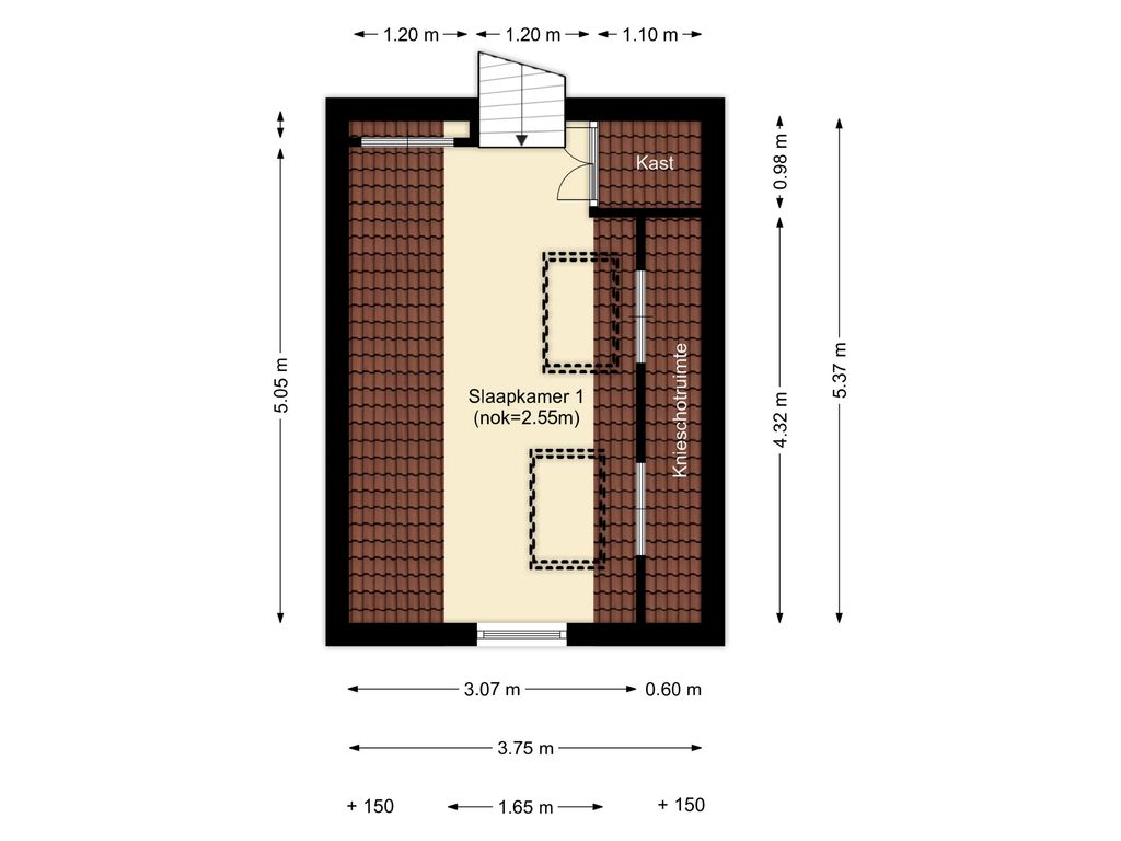 De ruime slaapkamer is gelegen aan de terraszijde van het appartement en beschikt over een plafond met spanten, kopgevelraam, dakraam, airconditioning en laminaatvloer. Tevens is er bergruimte achter de knieschotten.