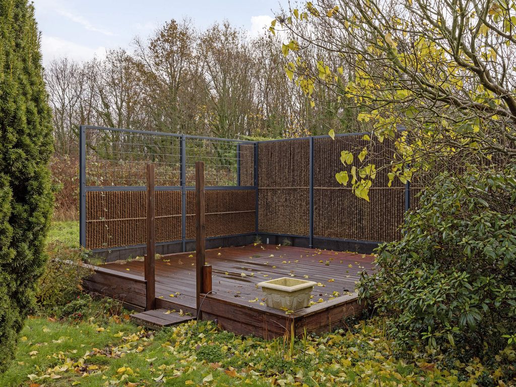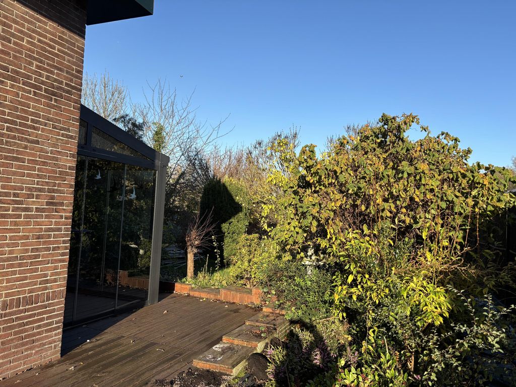 De royale tuin is rondom het huis gelegen en beschikt overeen afsluitbare overkapping, gras, volwassen struiken en bomen, borders en terrassen. Achter de tuin is thans een groenstrook.