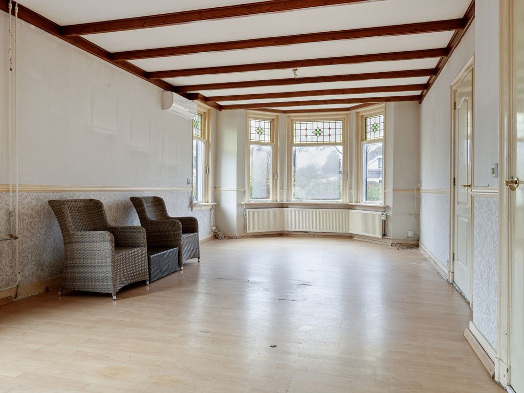 De sfeervolle woonkamer met airconditioning heeft een kenmerkende erker met glas-in-loodramen en zijramen welke zorgen voor een heerlijk lichte ruimte. Via de schuifpui in de terrasoverkapping bereikbaar. De vloer is v.v. laminaat.