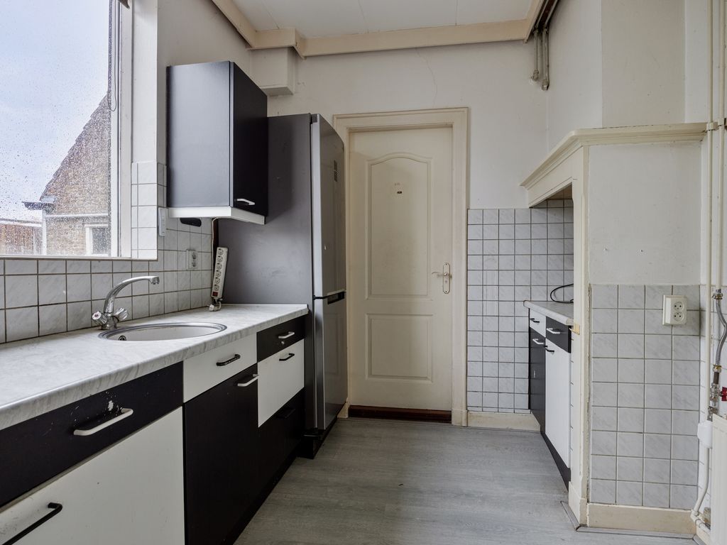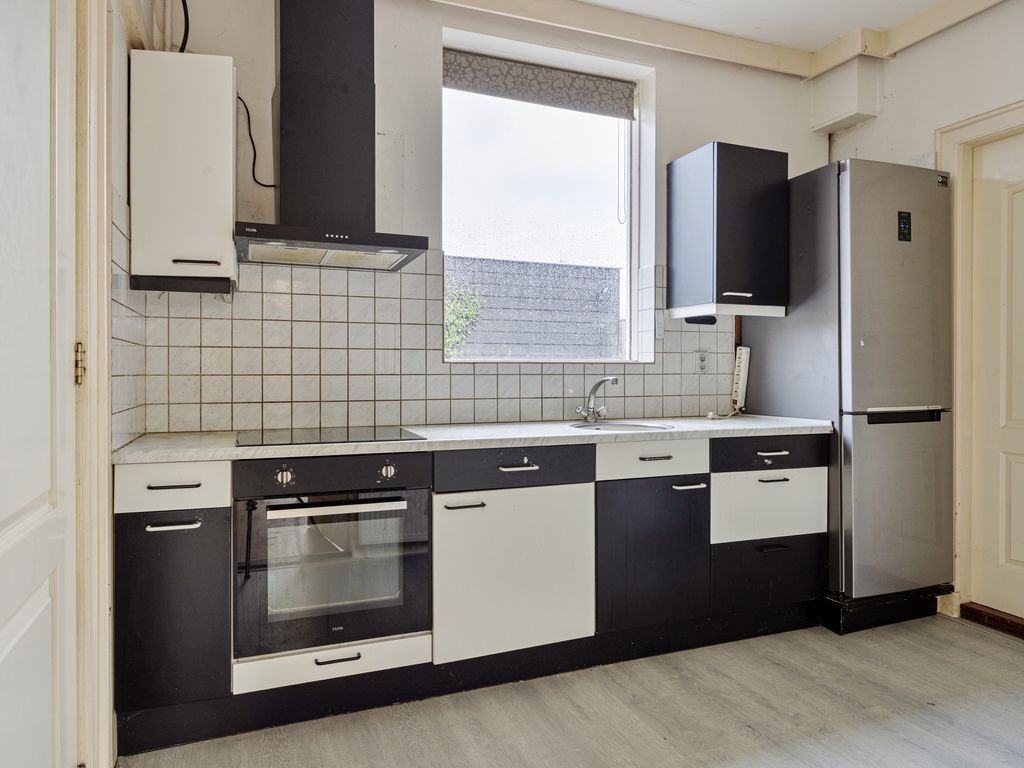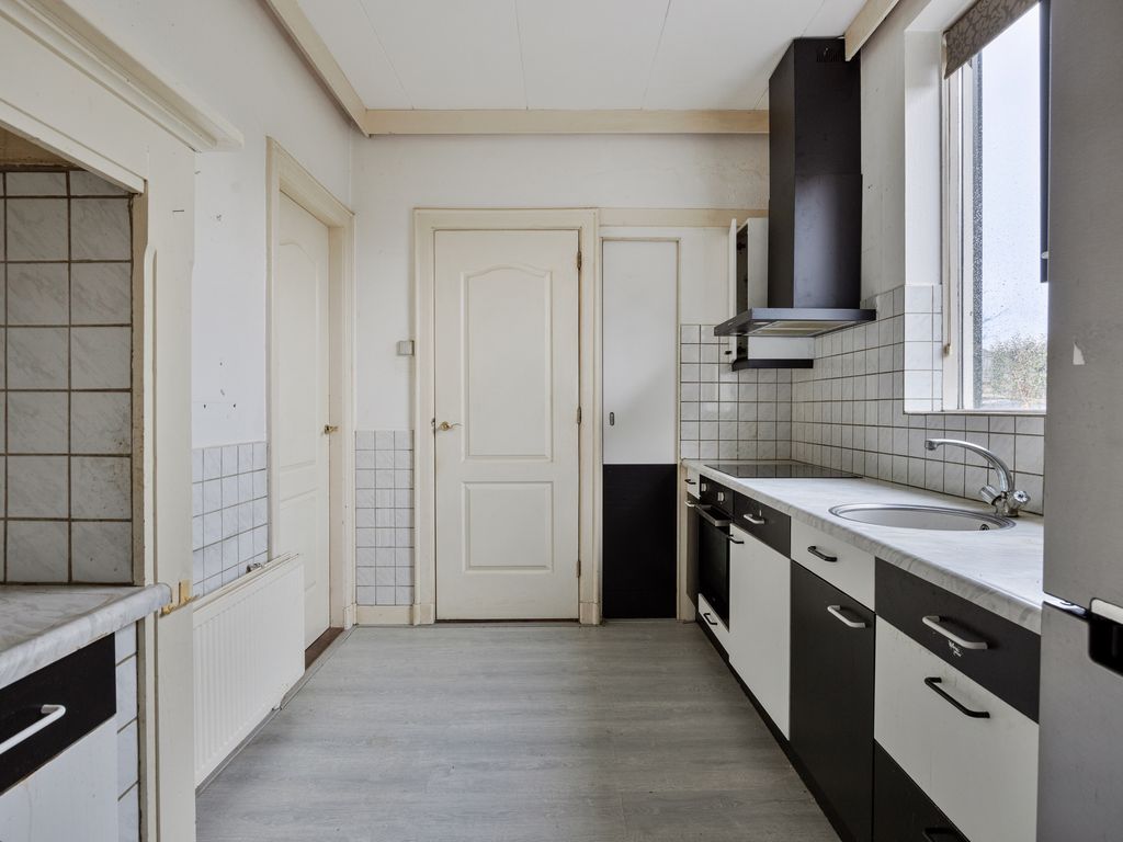 De dichte keuken is gelegen aan de achterzijde van de woning en beschikt over een eenvoudige wandopstelling. Deze basic opstelling beschikt over een spoelbak, kookplaat, afzuigkap, oven, koelkast en kelderkast.