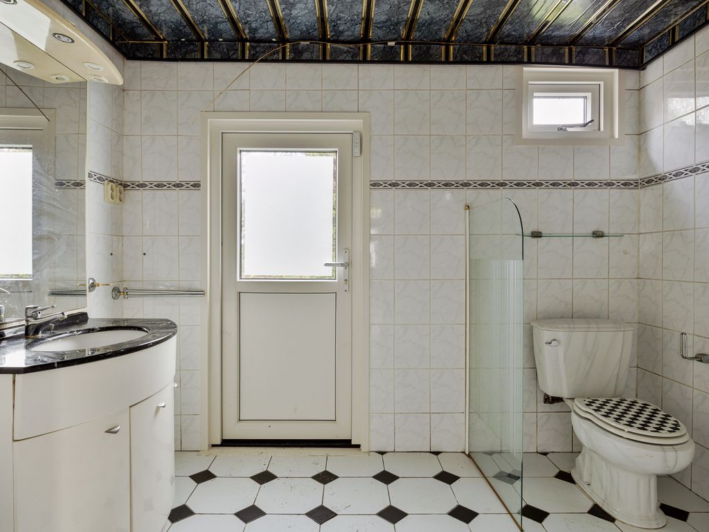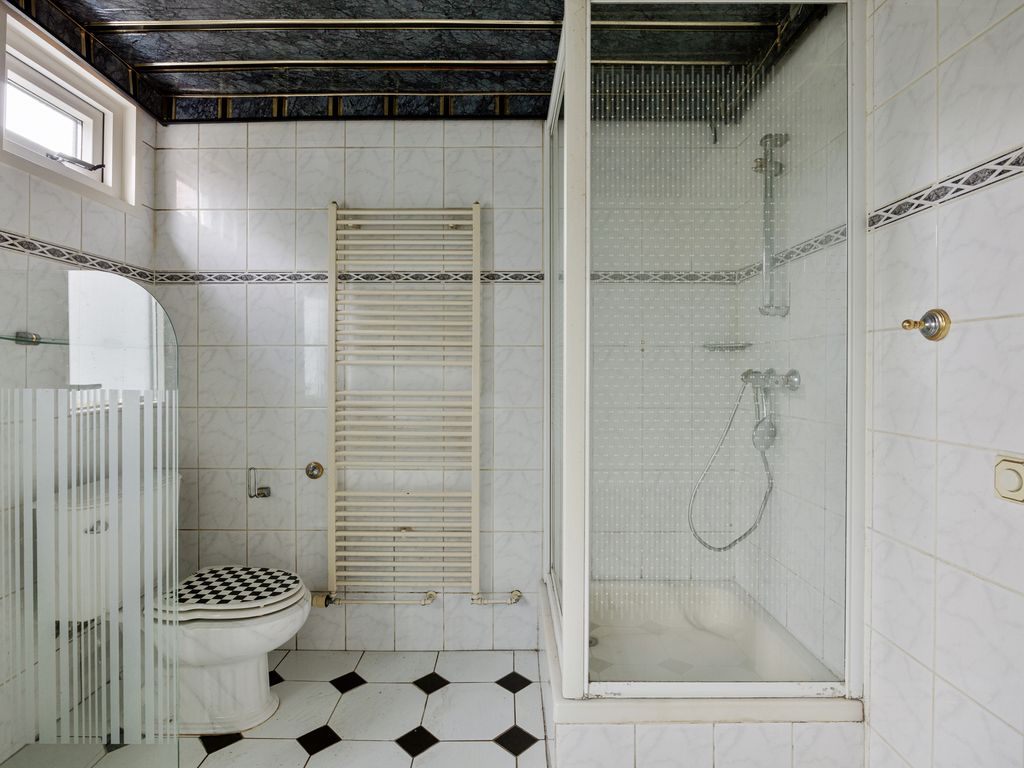 De aanbouw aan de achterzijde biedt plaats aan de badkamer. Deze is uitgevoerd met een douchecabine, wastafelmeubel en het toilet. In de badkamer is ook een deur naar de tuin. Kast met opstelplaats cv ketel.