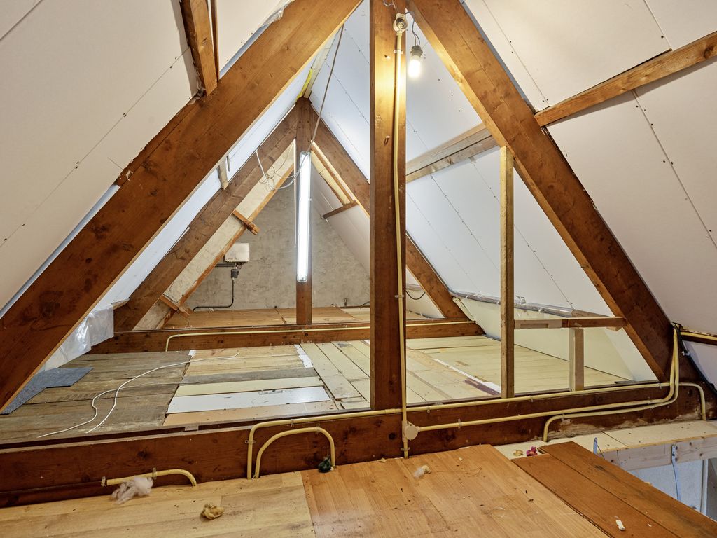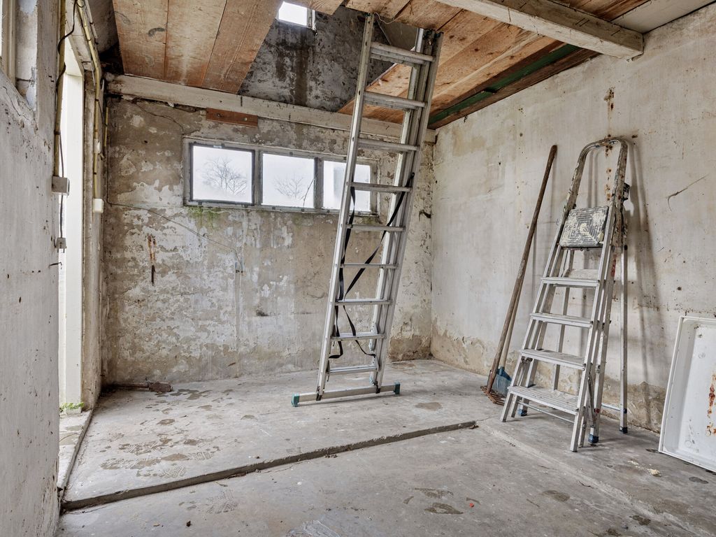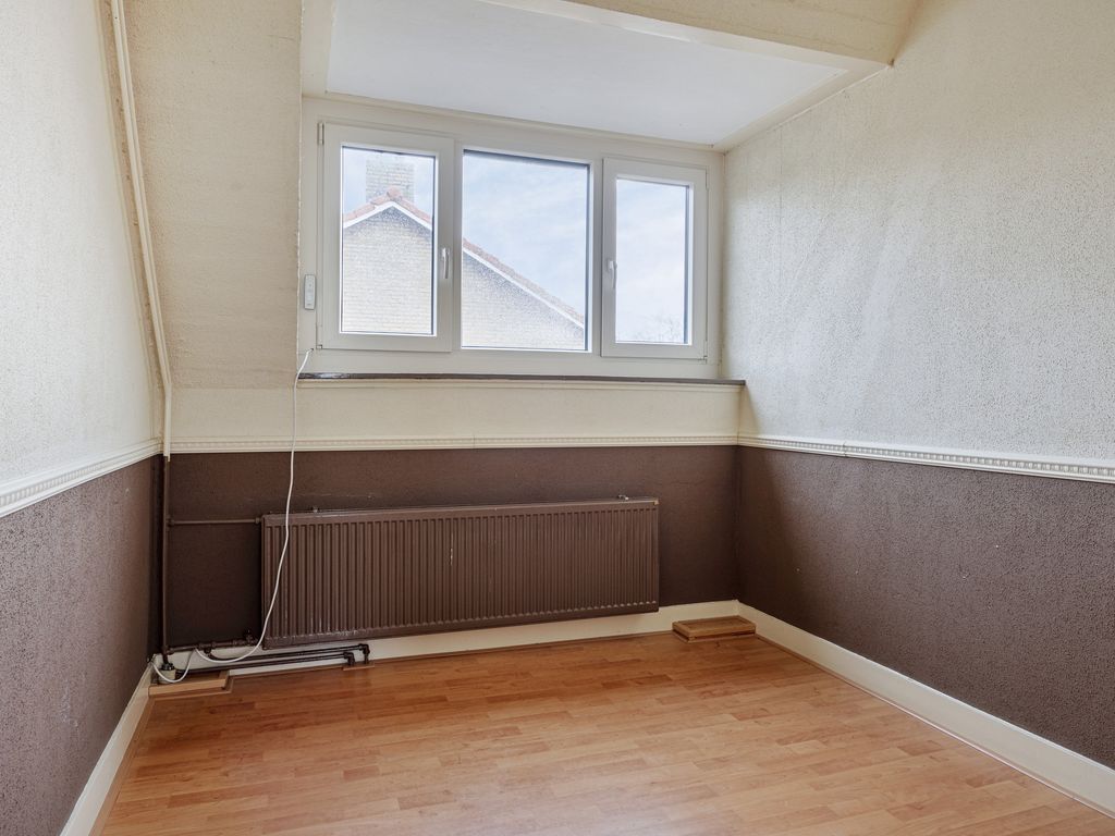 Deze slaapkamer is gelegen aan de tuinzijde van de woning en beschikt over wastafel, wasmachineaansluiting en een deur naar het platte dak van de uitbouw. Via het luik is de zolder bereikbaar.