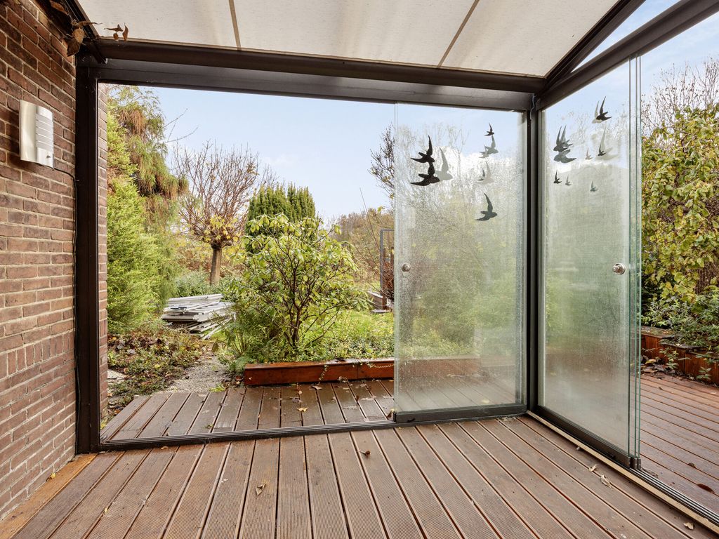 Terrasoverkapping van ca. 6m2 met afsluitbare glaswand en vlonder.