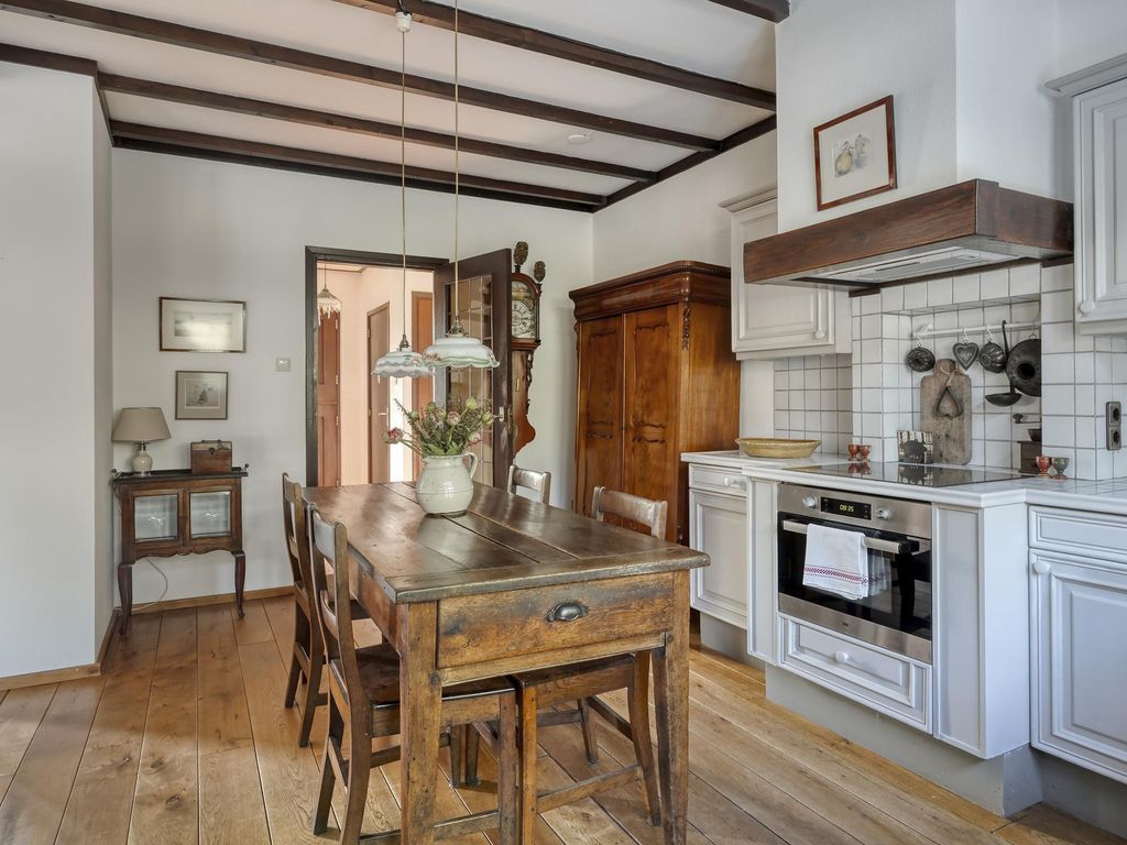 De royale doorzon-woonkamer is een fijne lichte ruimte. Het balkenplafond, de stalraampjes, de open haard en de erker aan de voorzijde geven de woonkamer extra sfeer. Aan zowel de voorzijde, als de achterzijde is een zonnescherm aanwezig, waarvan deze aan de achterzijde elektrisch is. De vloer is afgewerkt met eiken vloerdelen.