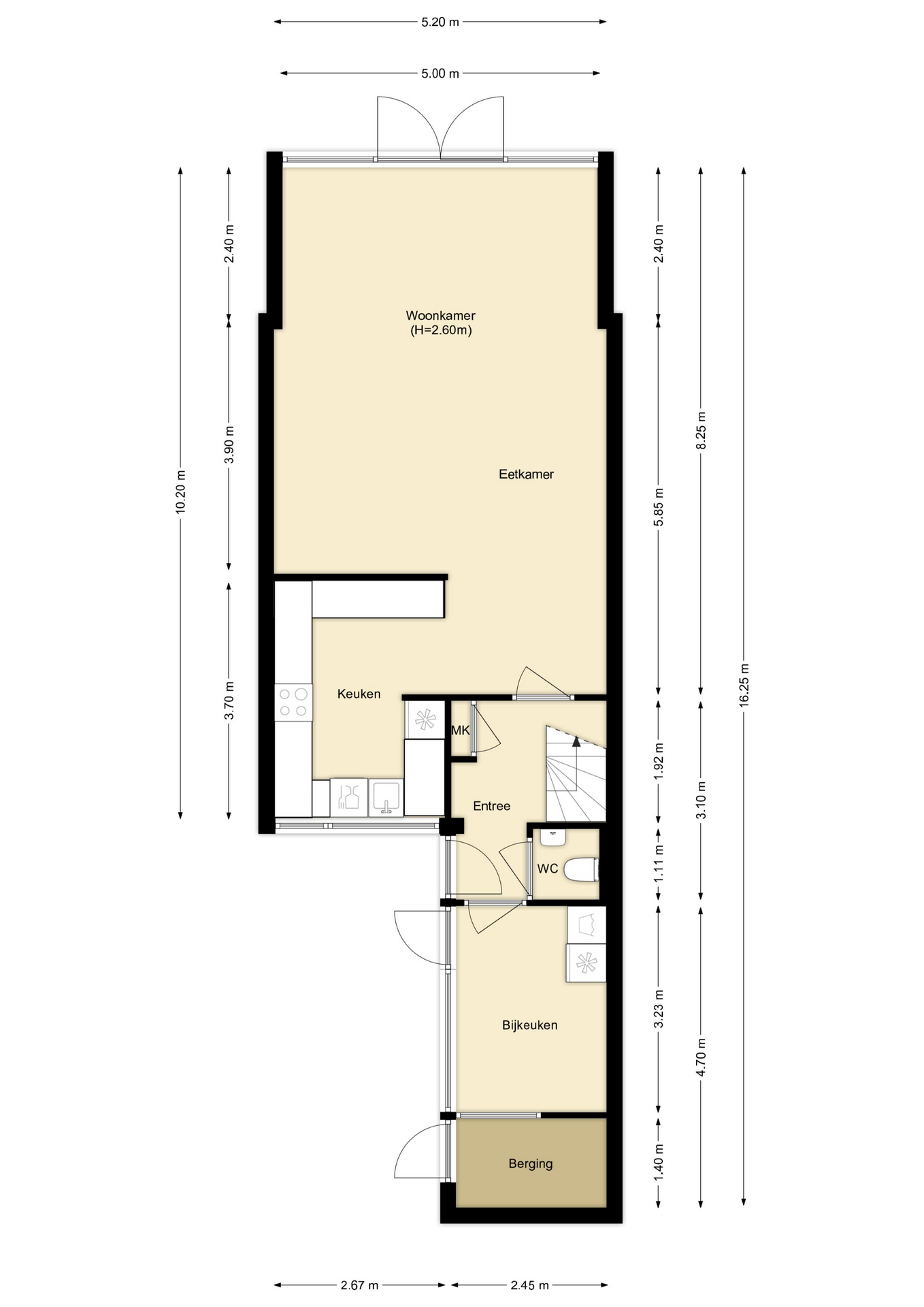 Entree/ hal met garderobe, meterkast met voldoende groepen en aardlekschakelaar, trapopgang, modern toilet met fonteintje. Tevens toegang naar de bijkeuken aan de voorzijde.