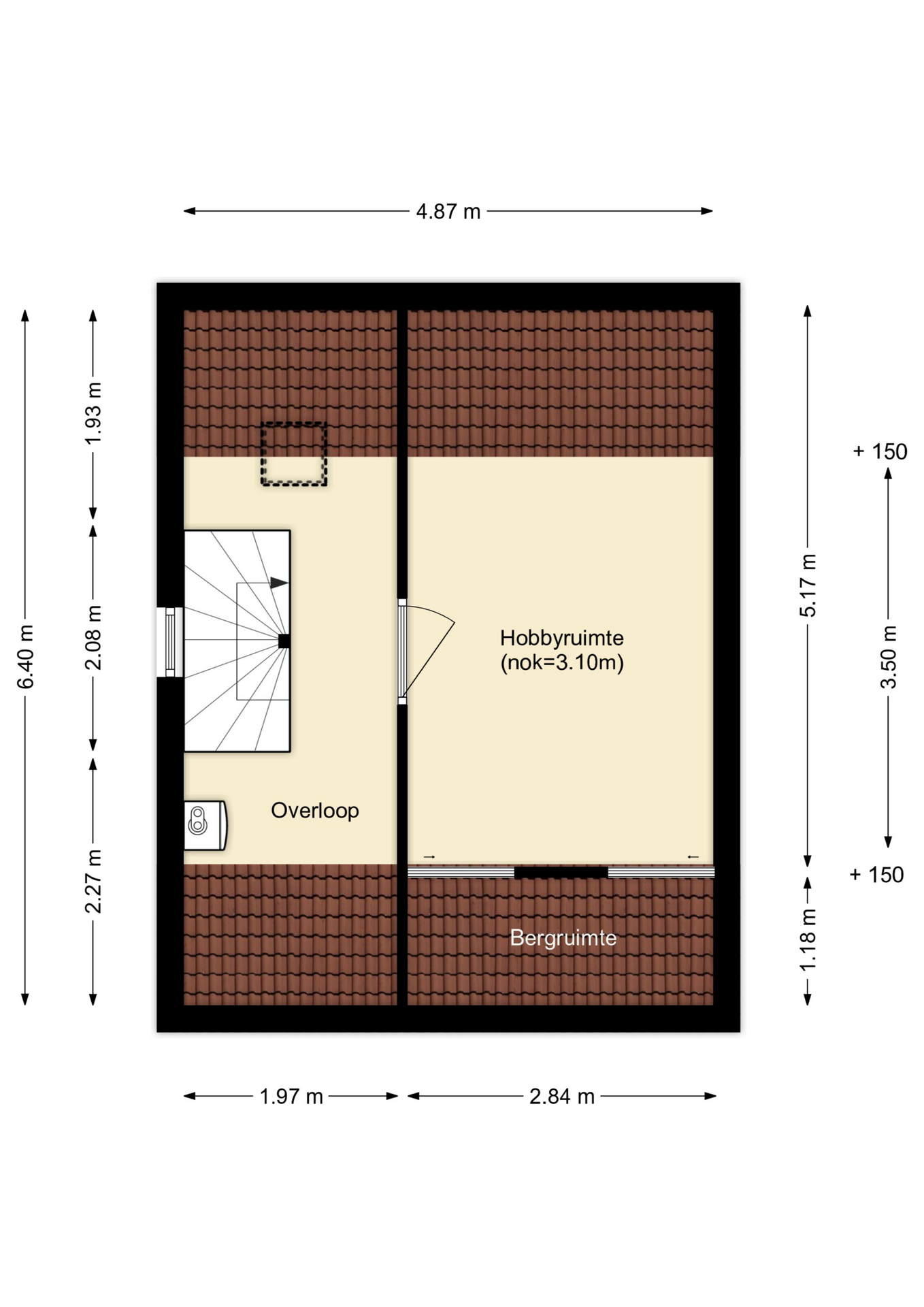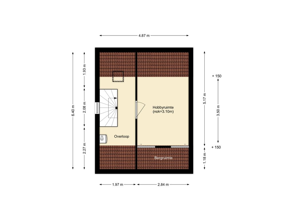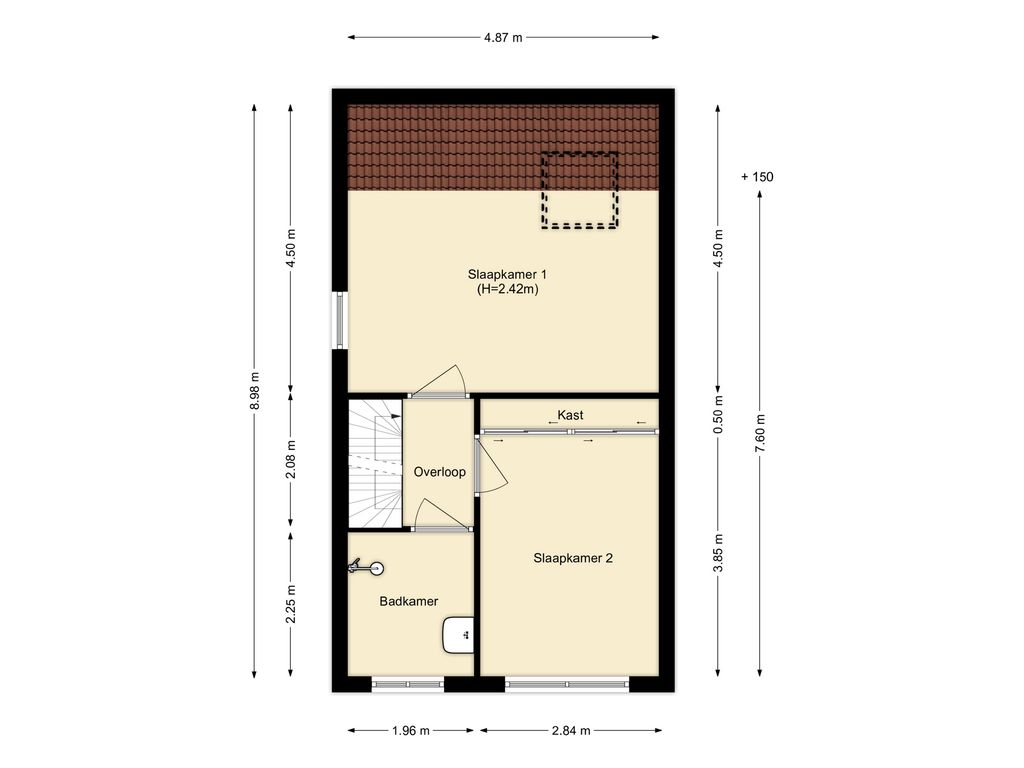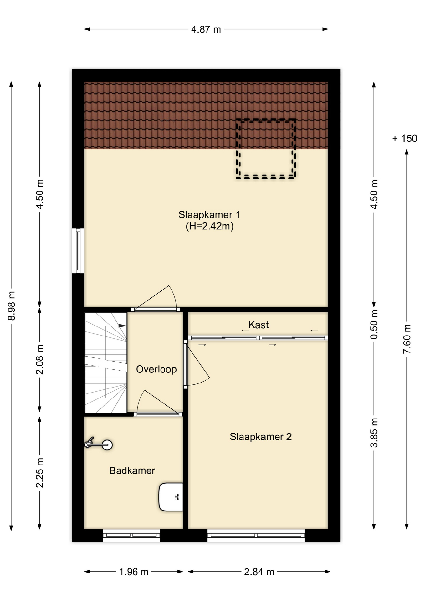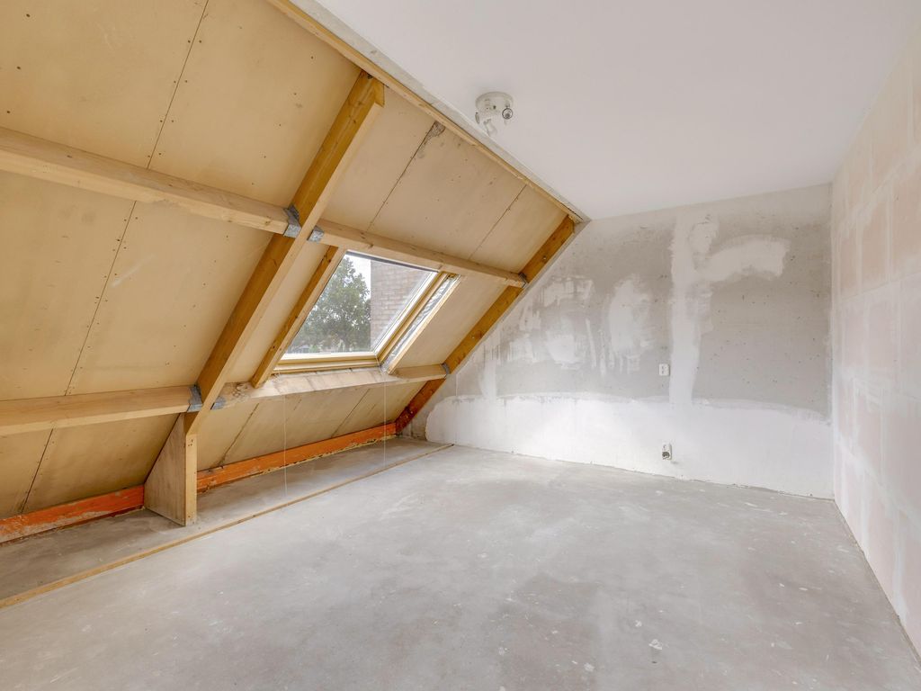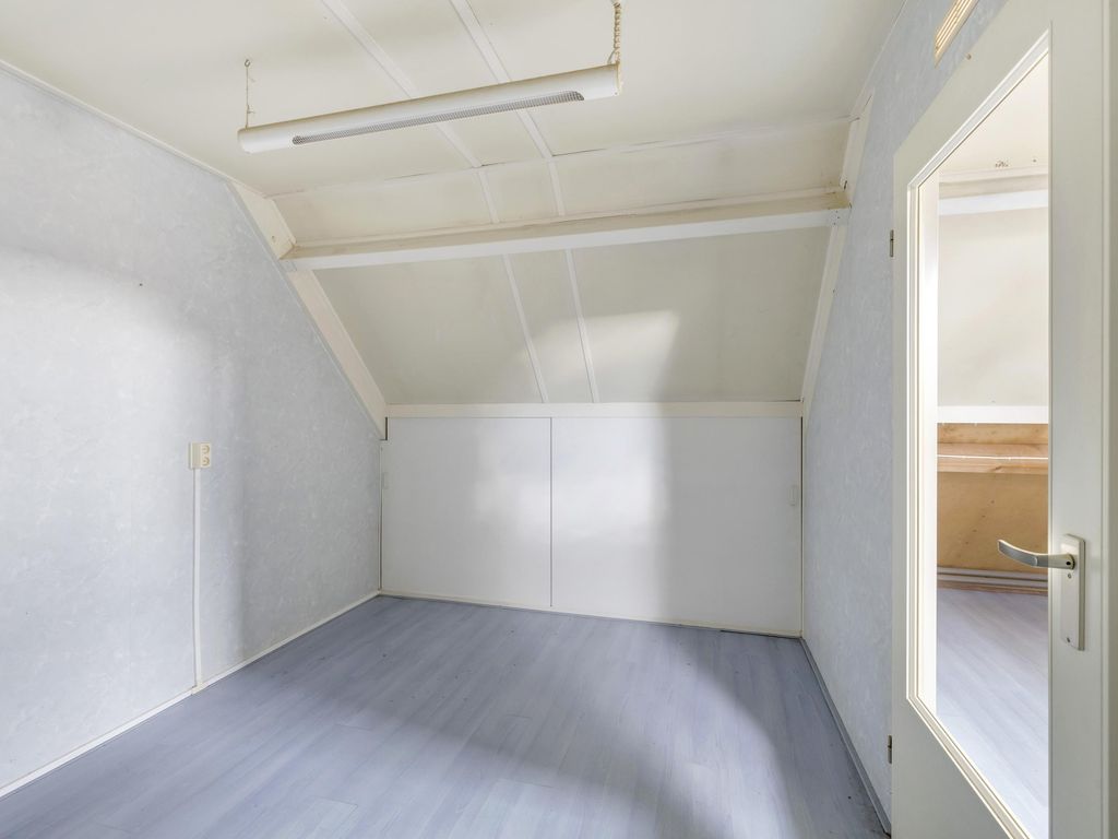 Deze kamer is voorzien van bergruimte achter knieschotten. Hier is mogelijk een dakraam of dakkapel te plaatsen.