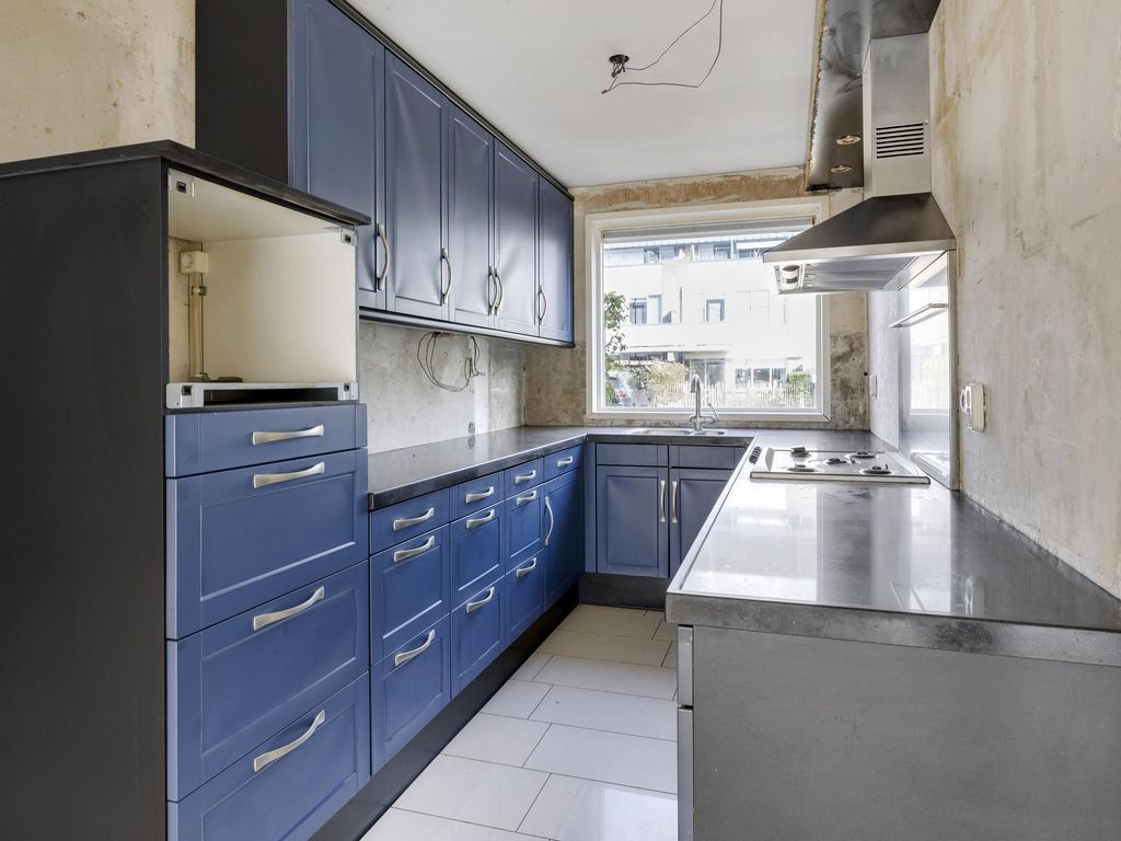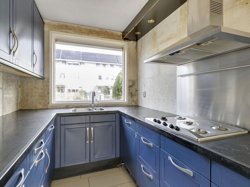 De open keuken bevindt zich aan de voorzijde van de woning. De eenvoudige U-opstelling is voorzien van spoelunit, vaatwasser, afzuigkap en gaskookplaat.