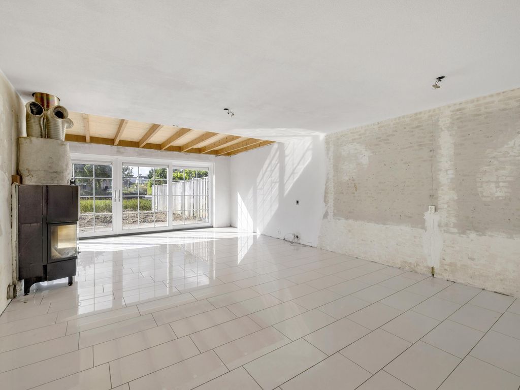 Lichte woonkamer met grote uitbouw en schuifpui naar de tuin. De woonkamer is v.v. plavuizen met vloerverwarming en houtkachel.