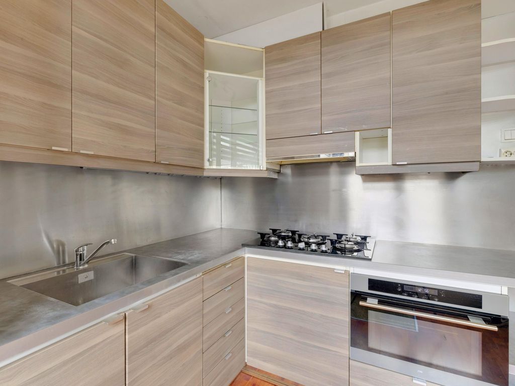 De keuken is gelegen aan de achterzijde van de woning en heeft toegang tot de tuin. De open keuken met een eenvoudige hoekopstelling is uitgerust met een spoelunit, 5-pits gaskookplaat, afzuigkap, combi-magnetron, koelkast en vaatwasmachine.
