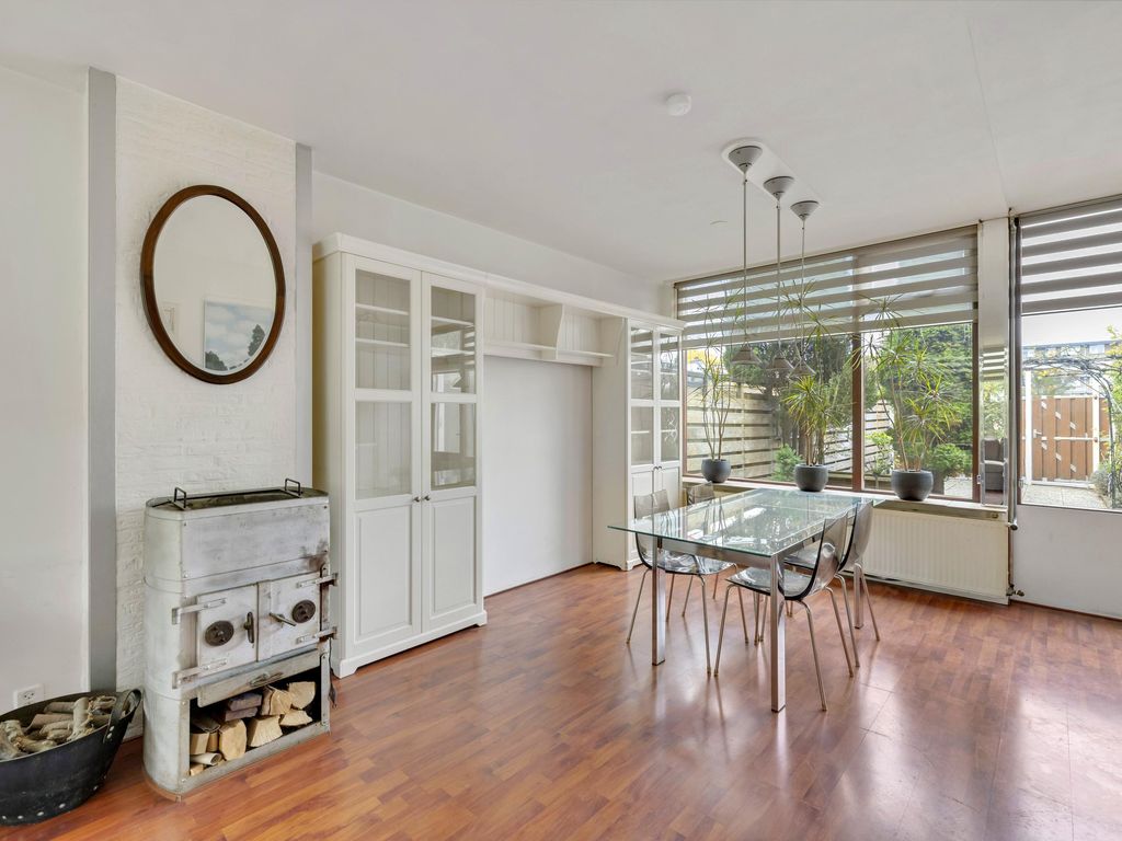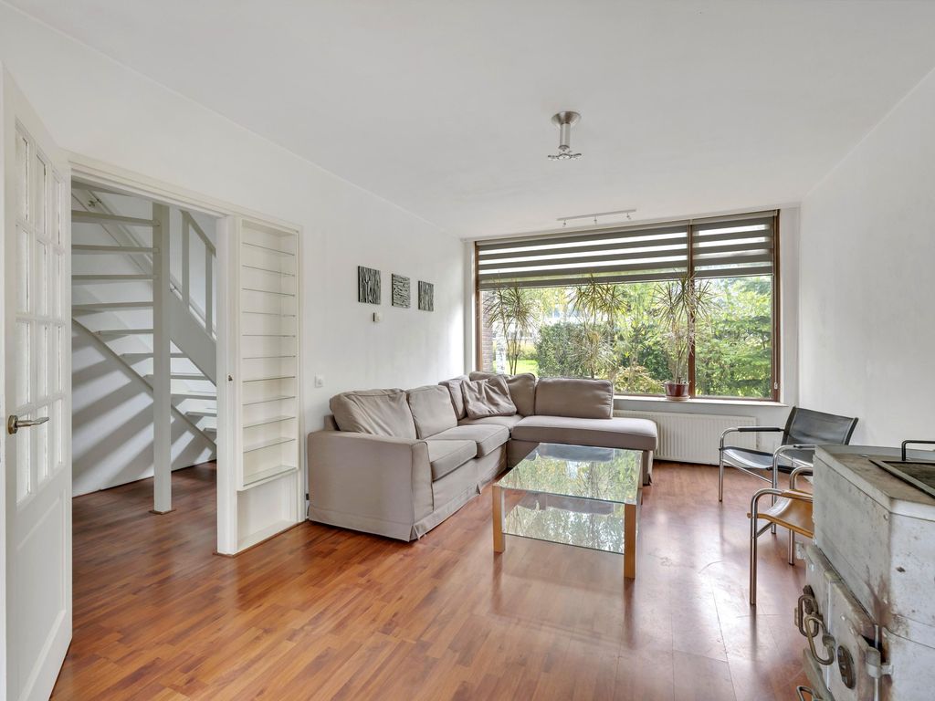 De ruime woonkamer is mede door de grote raampartijen aan de voor-en achterzijde een fijne lichte ruimte. De houtkachel geeft deze ruimte extra sfeer. Vanuit de woonkamer is er vrij zicht over de brede groenstrook.